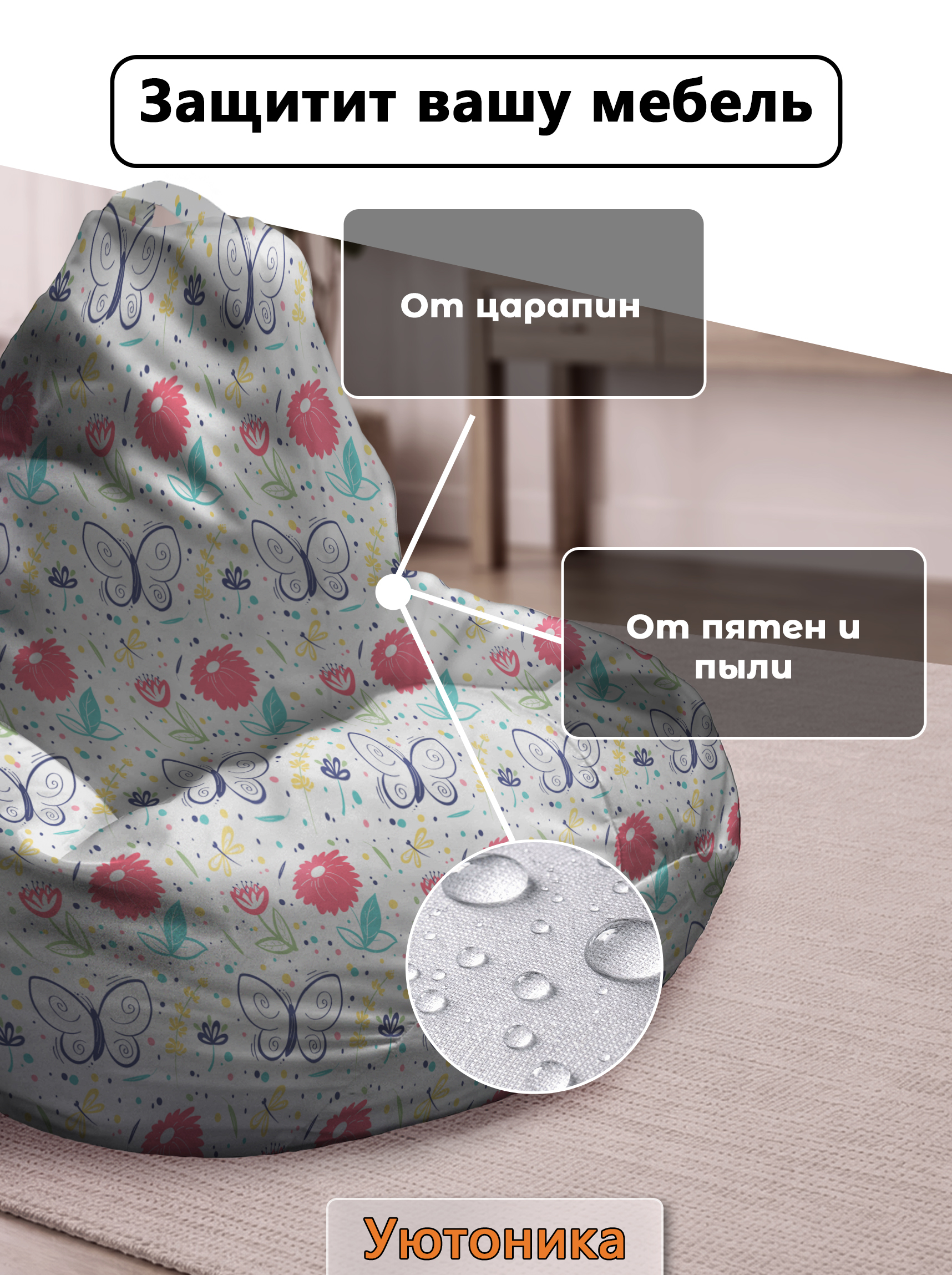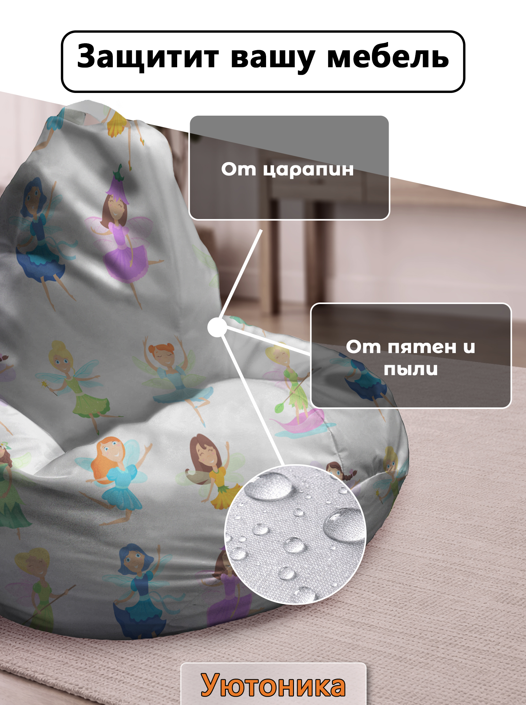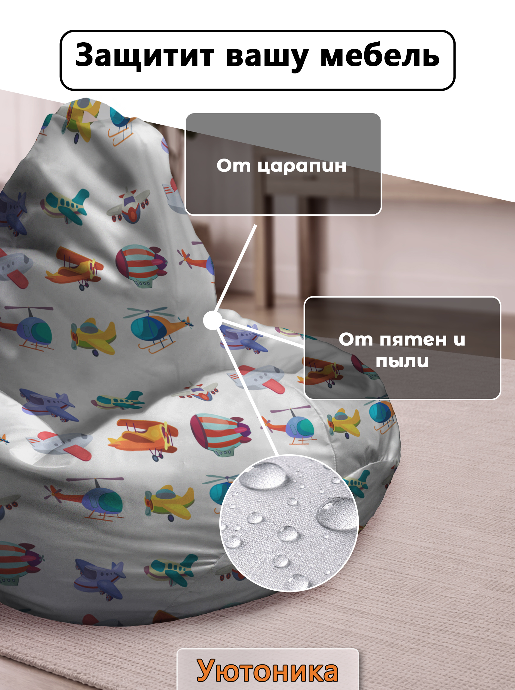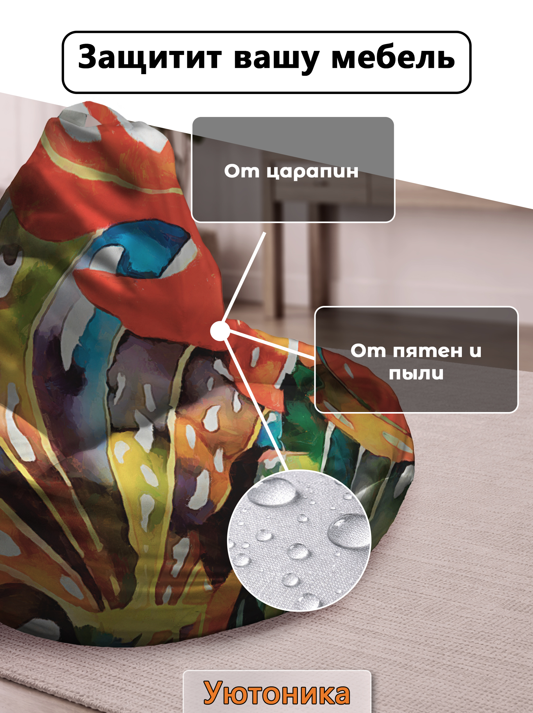 Чехол изготовлен из водонепроницаемой ткани Оксфорд. Светостойкое изображение, немнущийся практичный материал. Чехол можно стирать. Изделие имеет ручку для переноса кресла. Детали имеют усиленные швы. Размерный ряд: