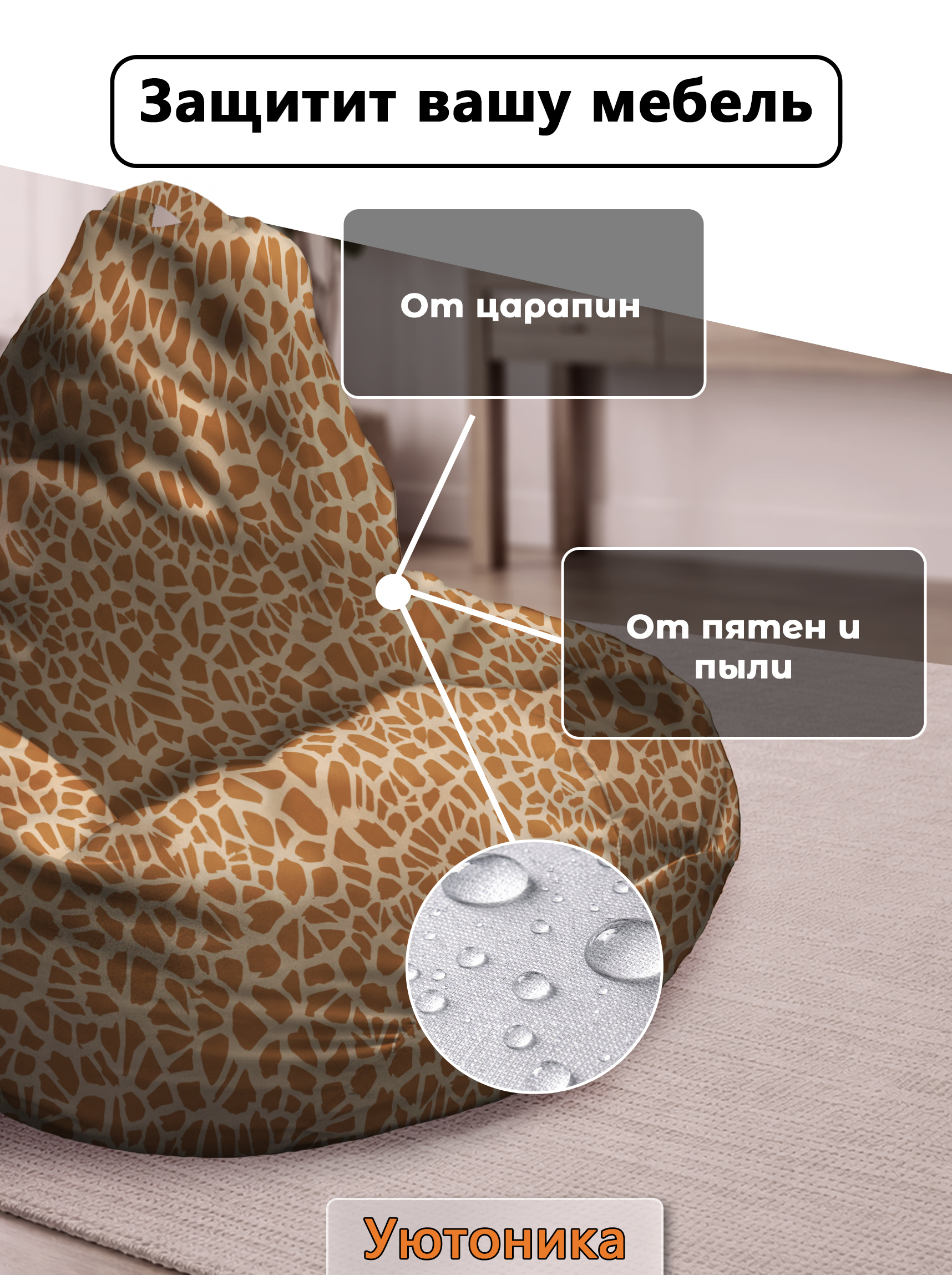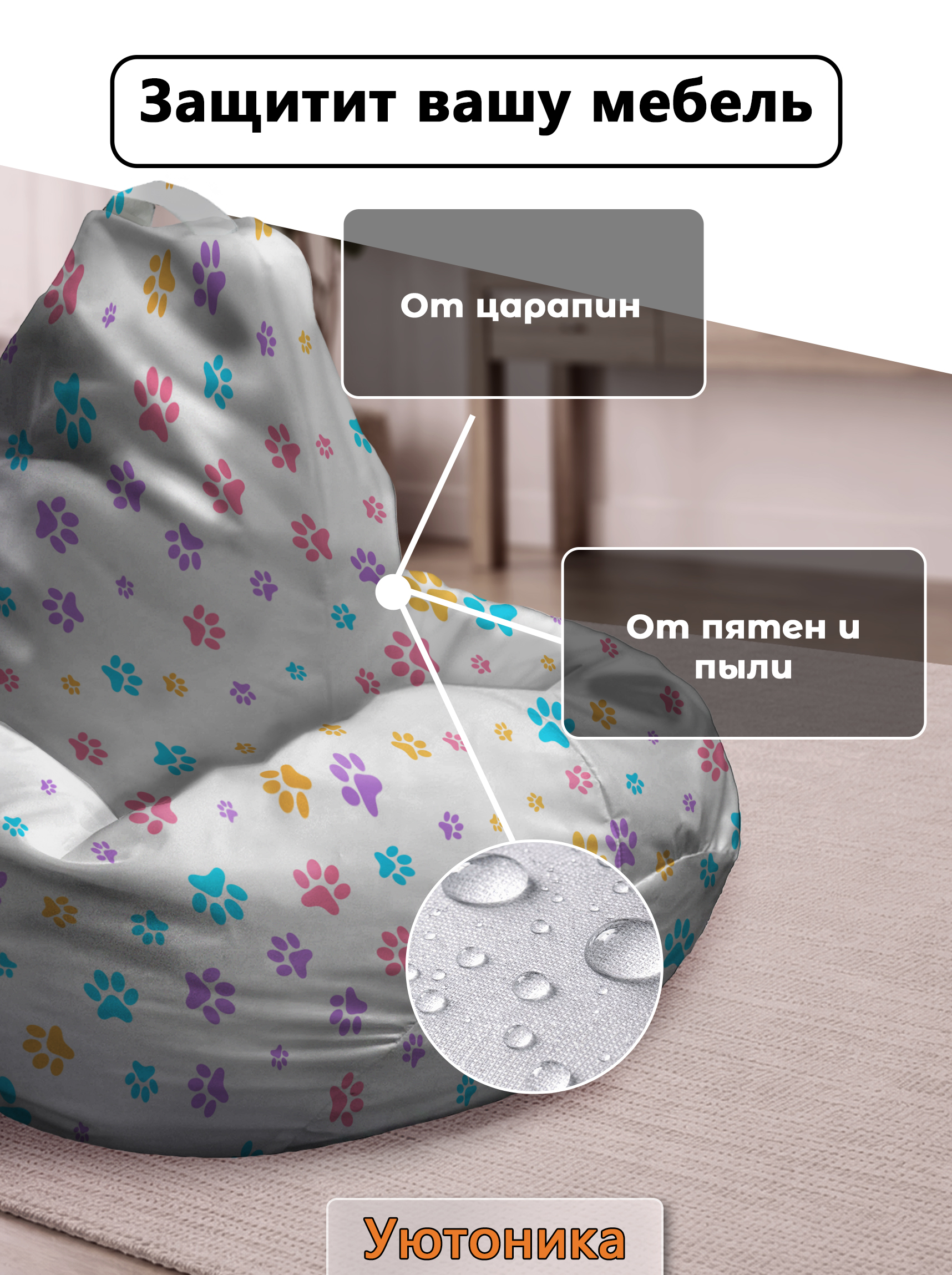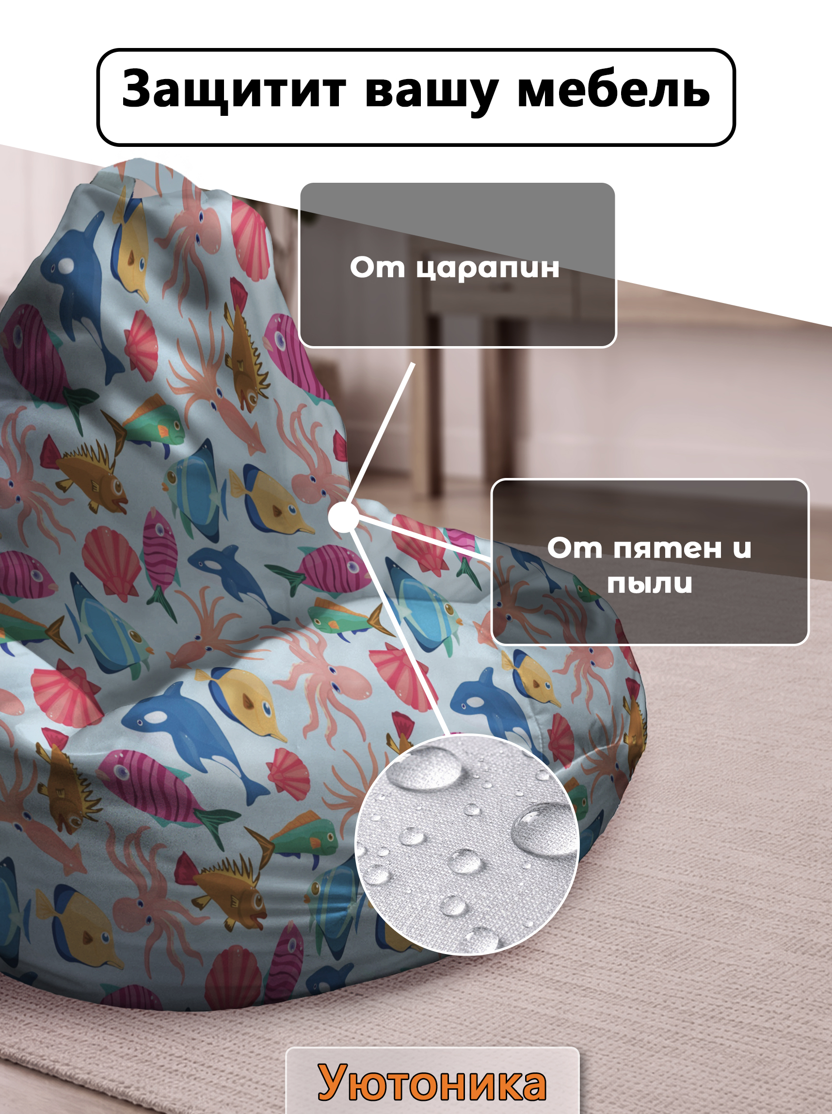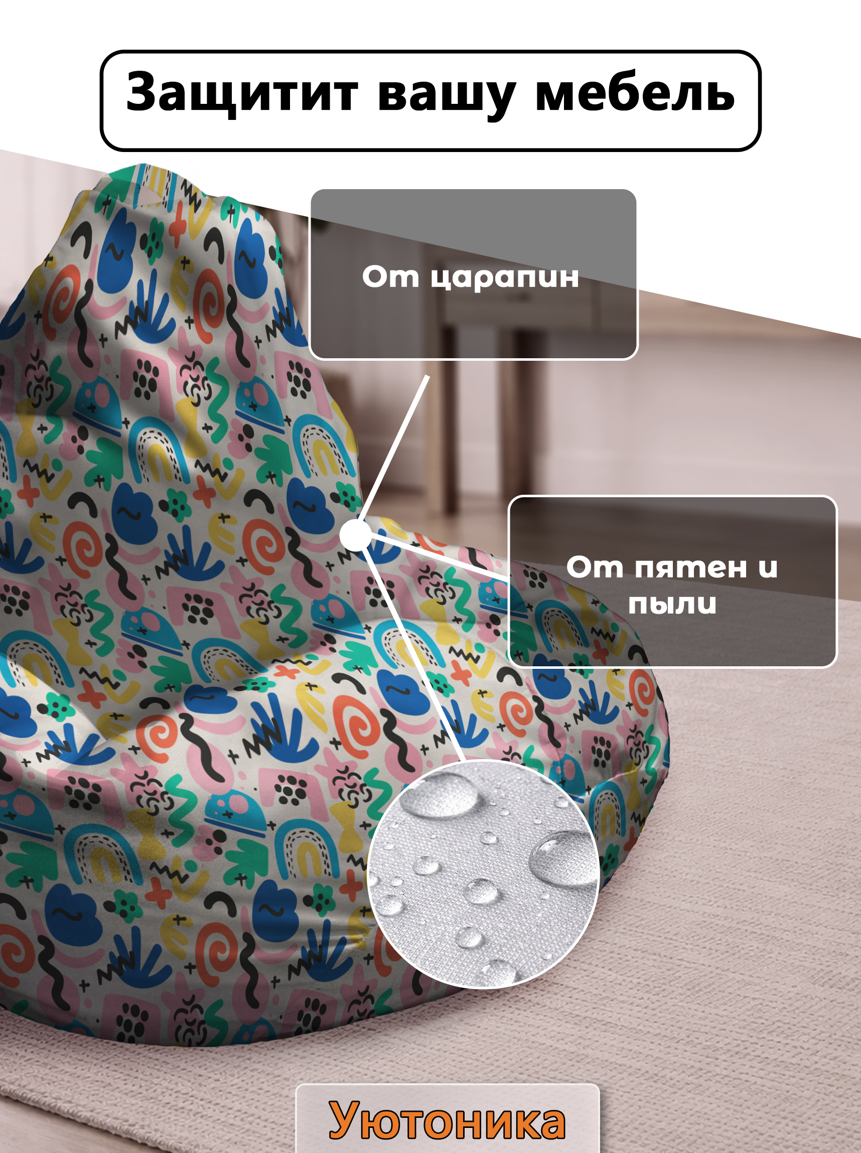 Чехол изготовлен из водонепроницаемой ткани Оксфорд. Светостойкое изображение, немнущийся практичный материал. Чехол можно стирать. Изделие имеет ручку для переноса кресла. Детали имеют усиленные швы. Размерный ряд: