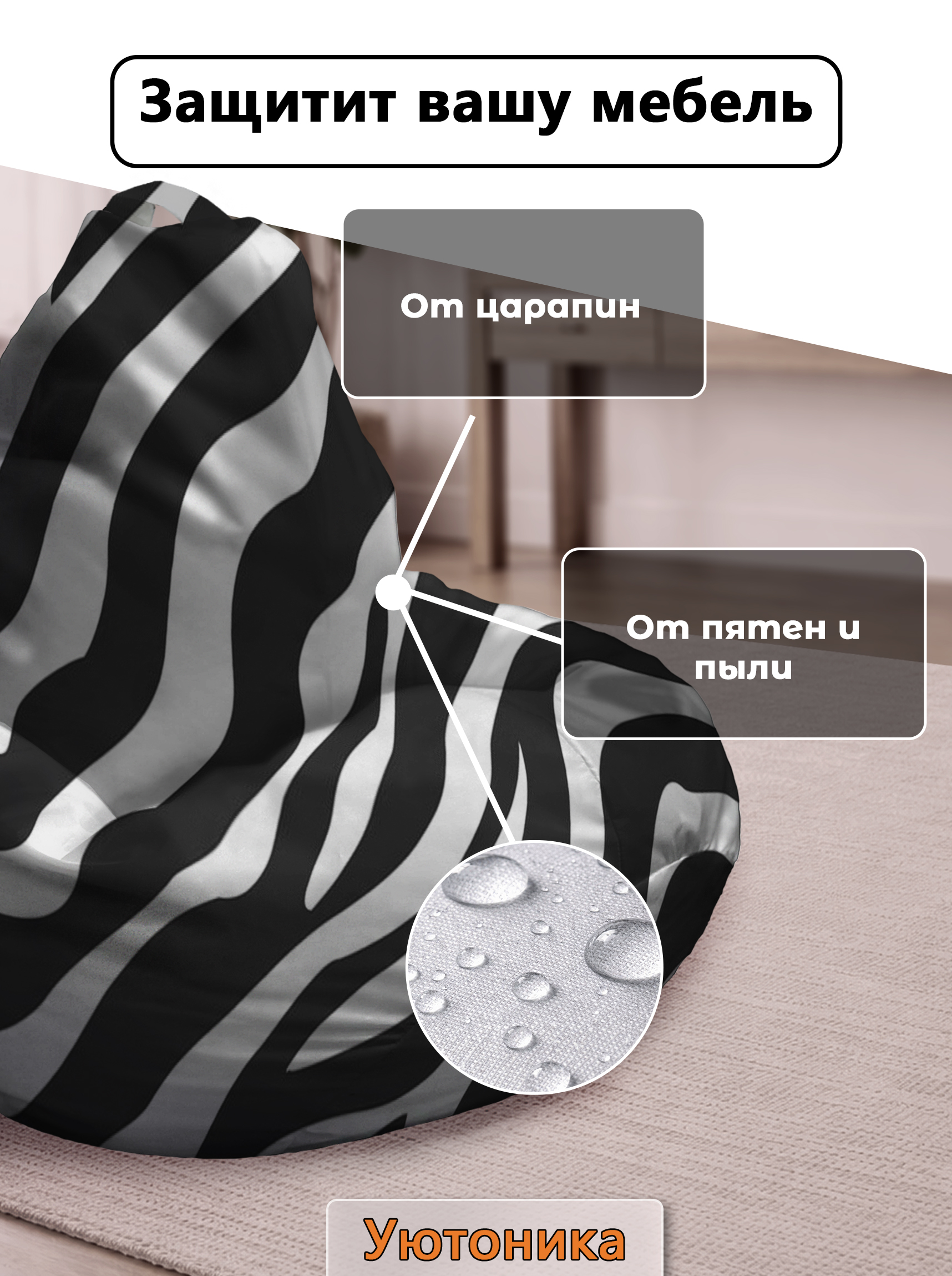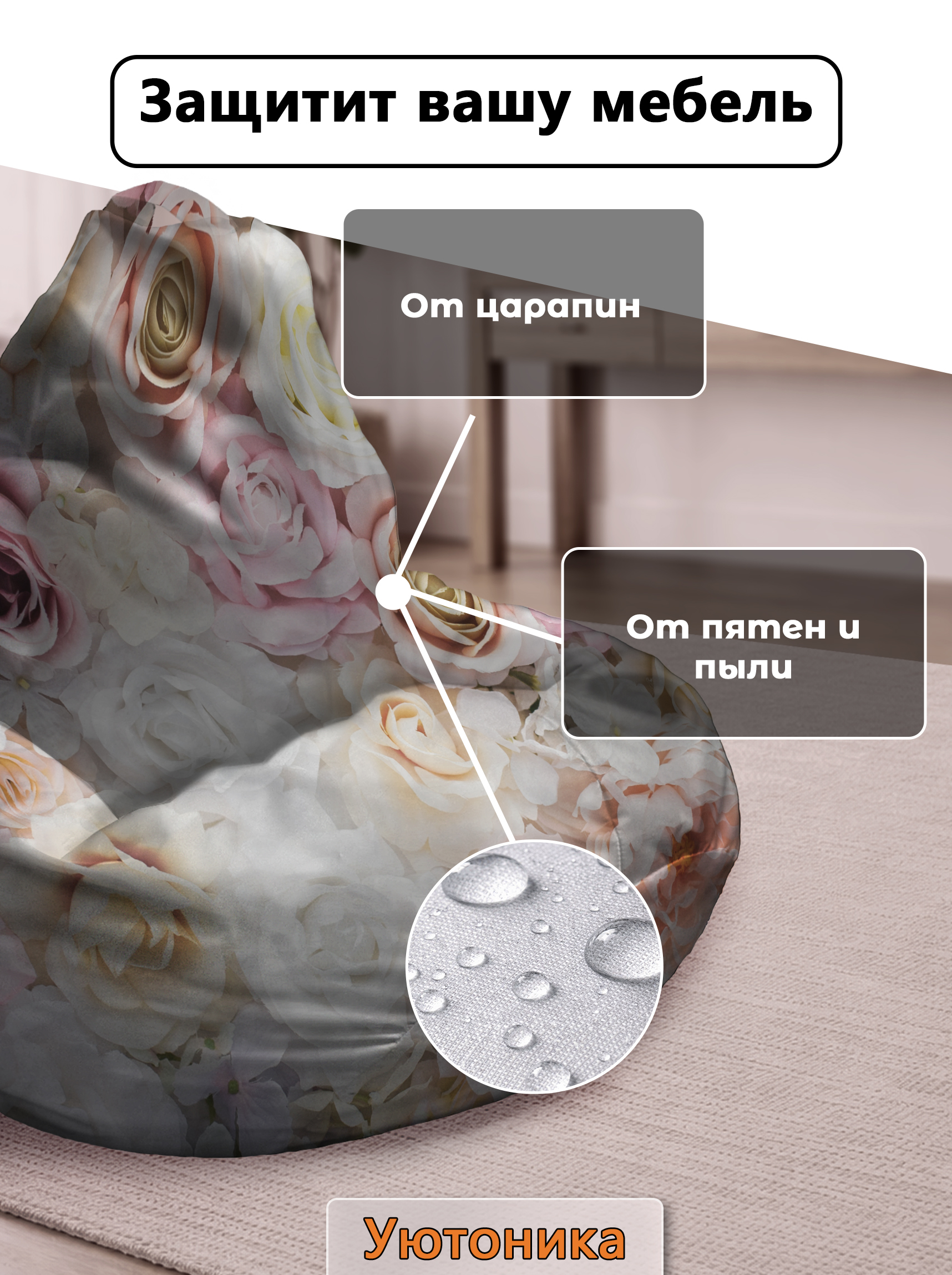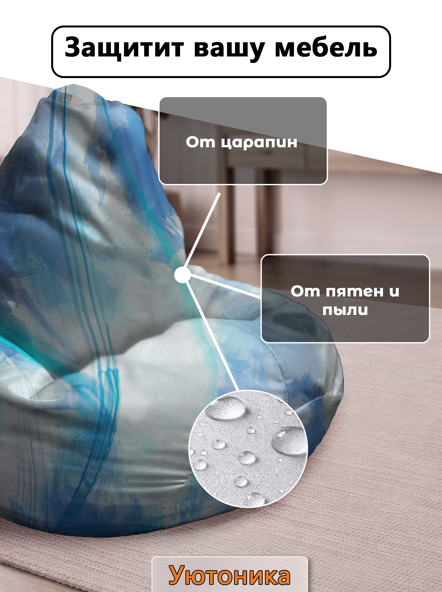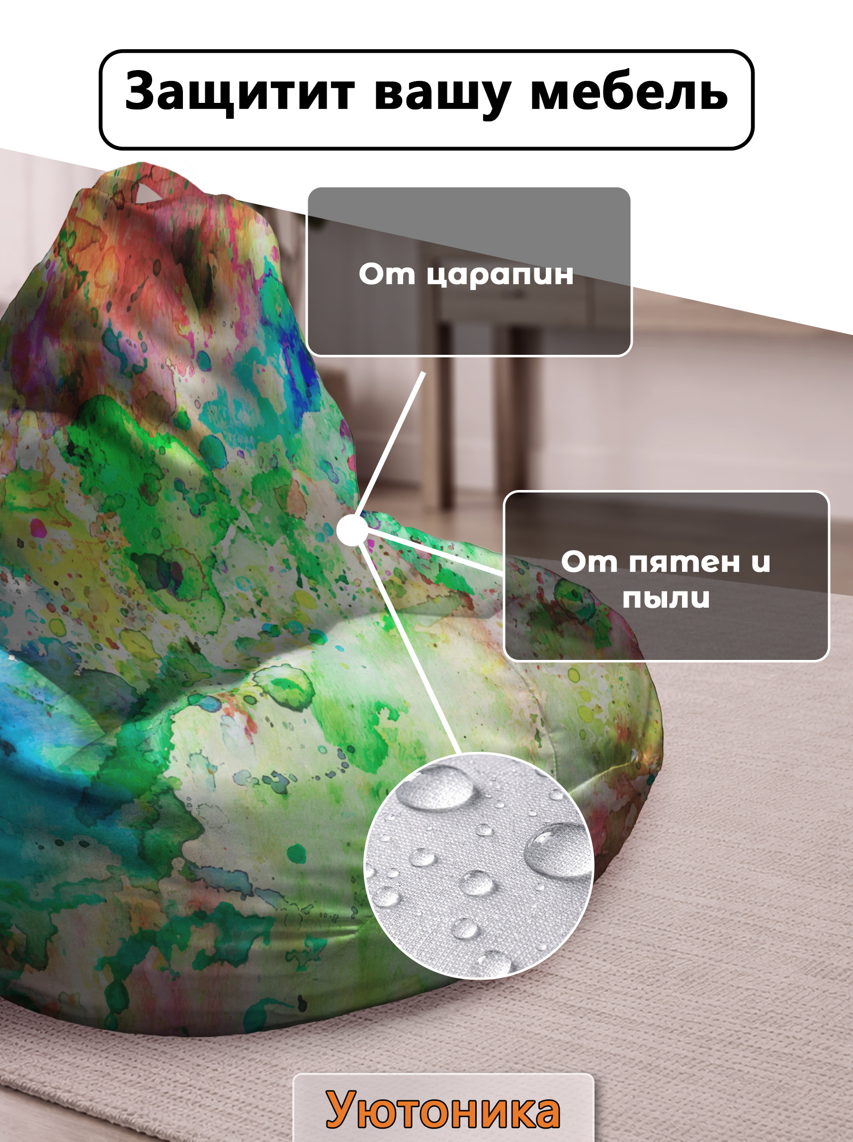 Чехол изготовлен из водонепроницаемой ткани Оксфорд. Светостойкое изображение, немнущийся практичный материал. Чехол можно стирать. Изделие имеет ручку для переноса кресла. Детали имеют усиленные швы. Размерный ряд: