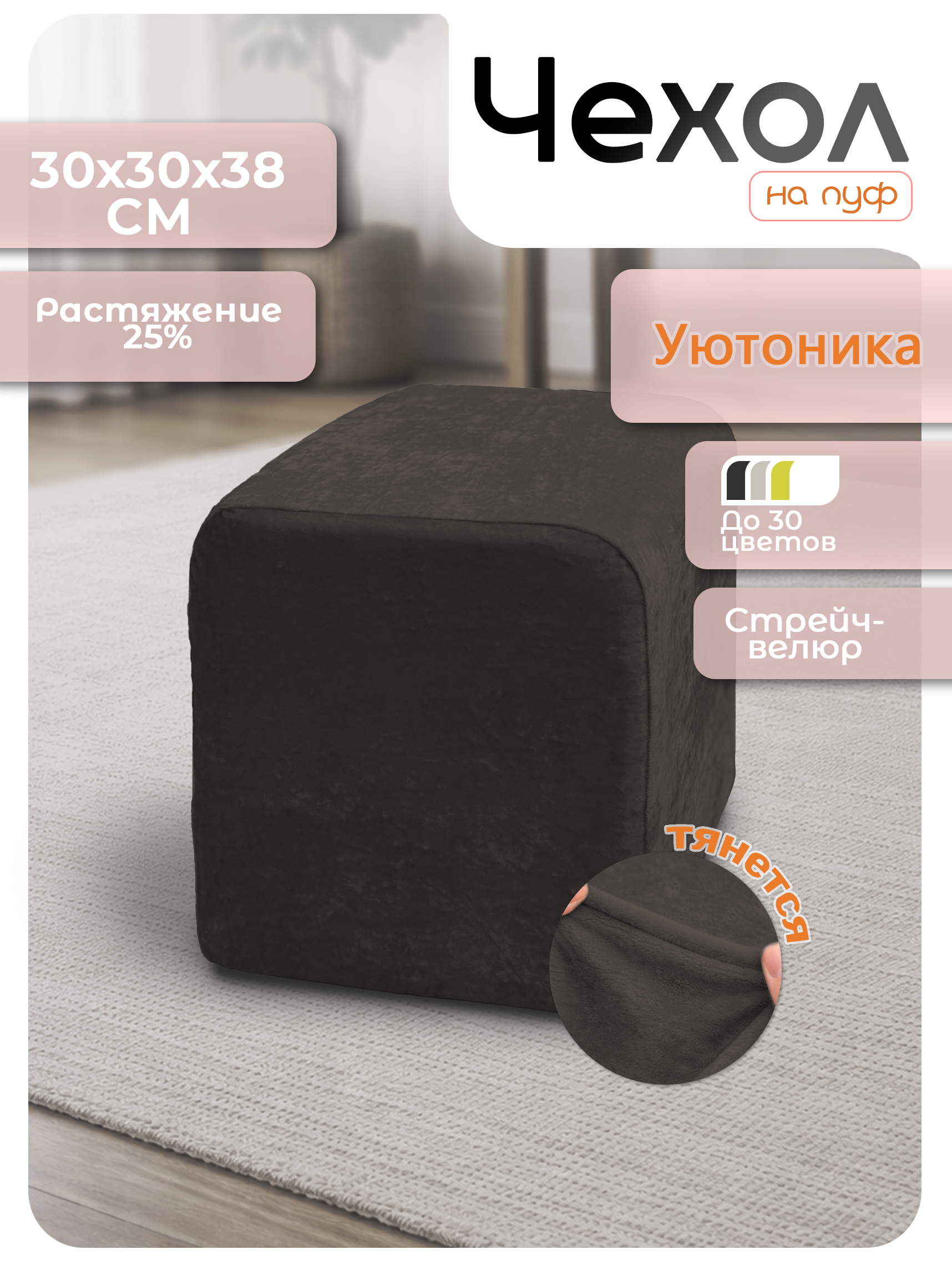 Квадратный чехол на пуфик размером 30 на 30 см и высотой 38 см изготовлен из стрейчевого велюра, который тянется до 25%. Снизу чехол фиксируется резинкой. Эта накидка защитит ваш пуфик от загрязнений, царапин, когтей домашних животных и потёртостей, придаст ему новый вид и поднимет настроение.