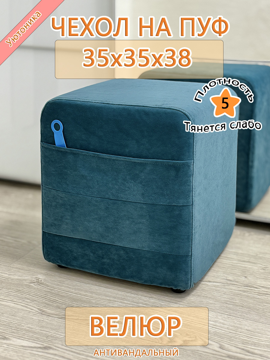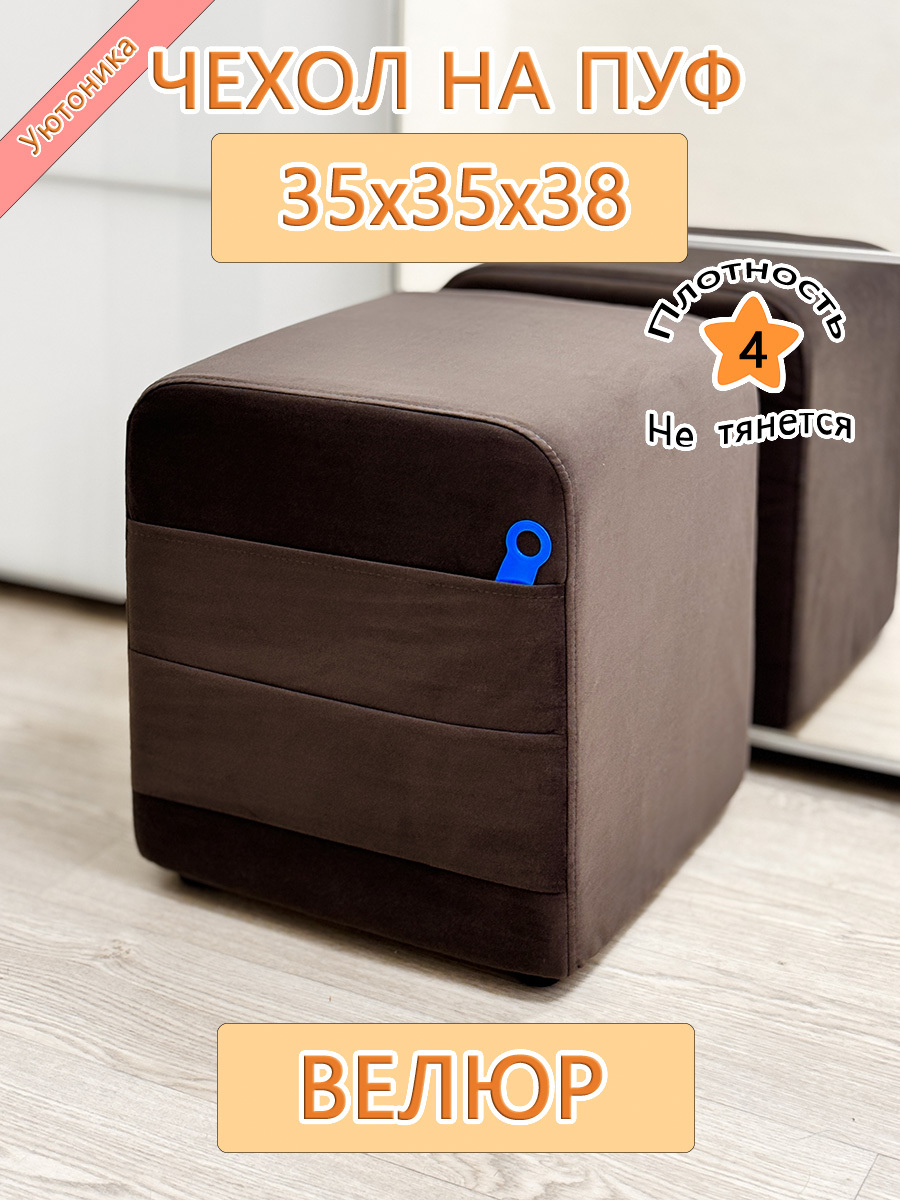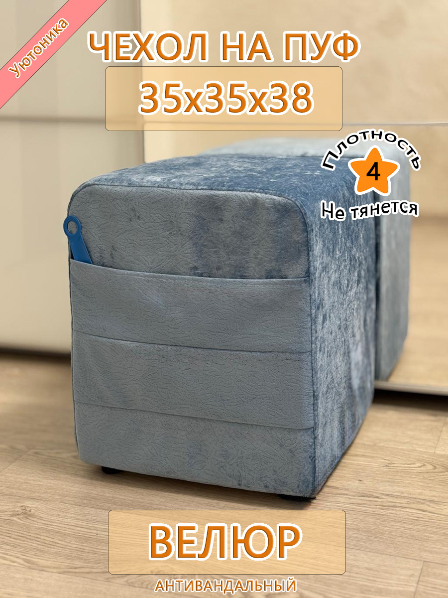Чехол на пуфик квадратный 35 на 35 см высотой 38 см. Чехол на пуфик изготовлен из антивандального велюра. Материал не тянется. Чехол может подойти на пуфик квадратный 34 на 34, при этом высота его изменится соответственно. Снизу фиксируется крепким шнурком - более надёжным аналогом резинки. Эта накидка на пуф защитит Ваш пуфик от загрязнений, царапин, когтей домашних животных и потёртостей. Чехол на пуфик вернёт жизнь Вашему старому пуфу, добавит изюминку интерьеру и поднимет Вам настроение. Чехол легко очищается от шерсти домашних животных, пыли, грязи и пятен. Чехол из велюра стирается в стиральной машине при температуре 30-40 градусов. Изделие будет служить Вам долгие годы! Чтобы правильно подобрать размер чехла переверните свой пуфик вниз сиденьем, измерьте его высоту от пола до дна, измерьте расстояние от края до ножек на подгиб. Для измерения длины и ширины положите пуф на бок и измерьте расстояние от пола до верхней точки.
