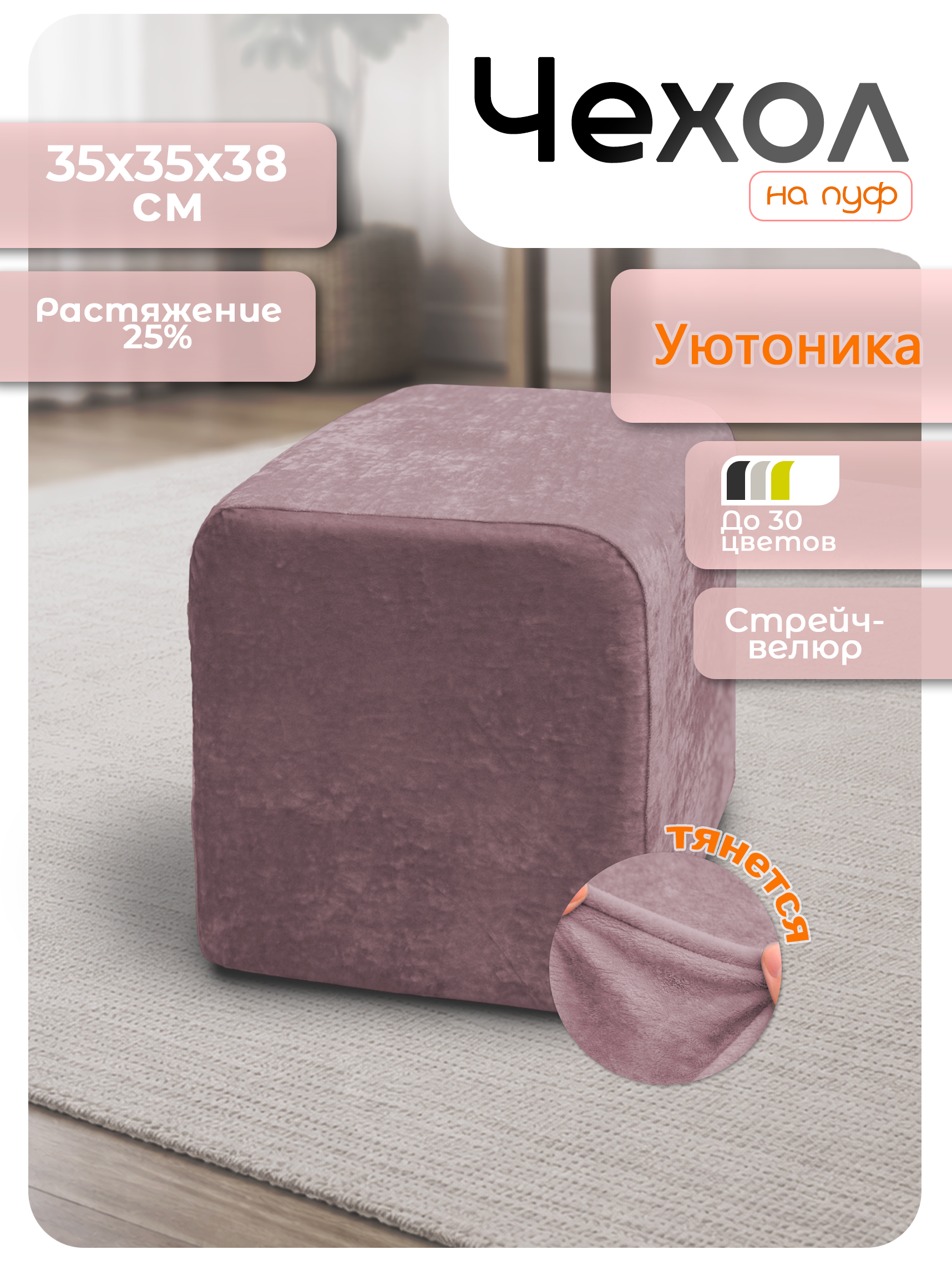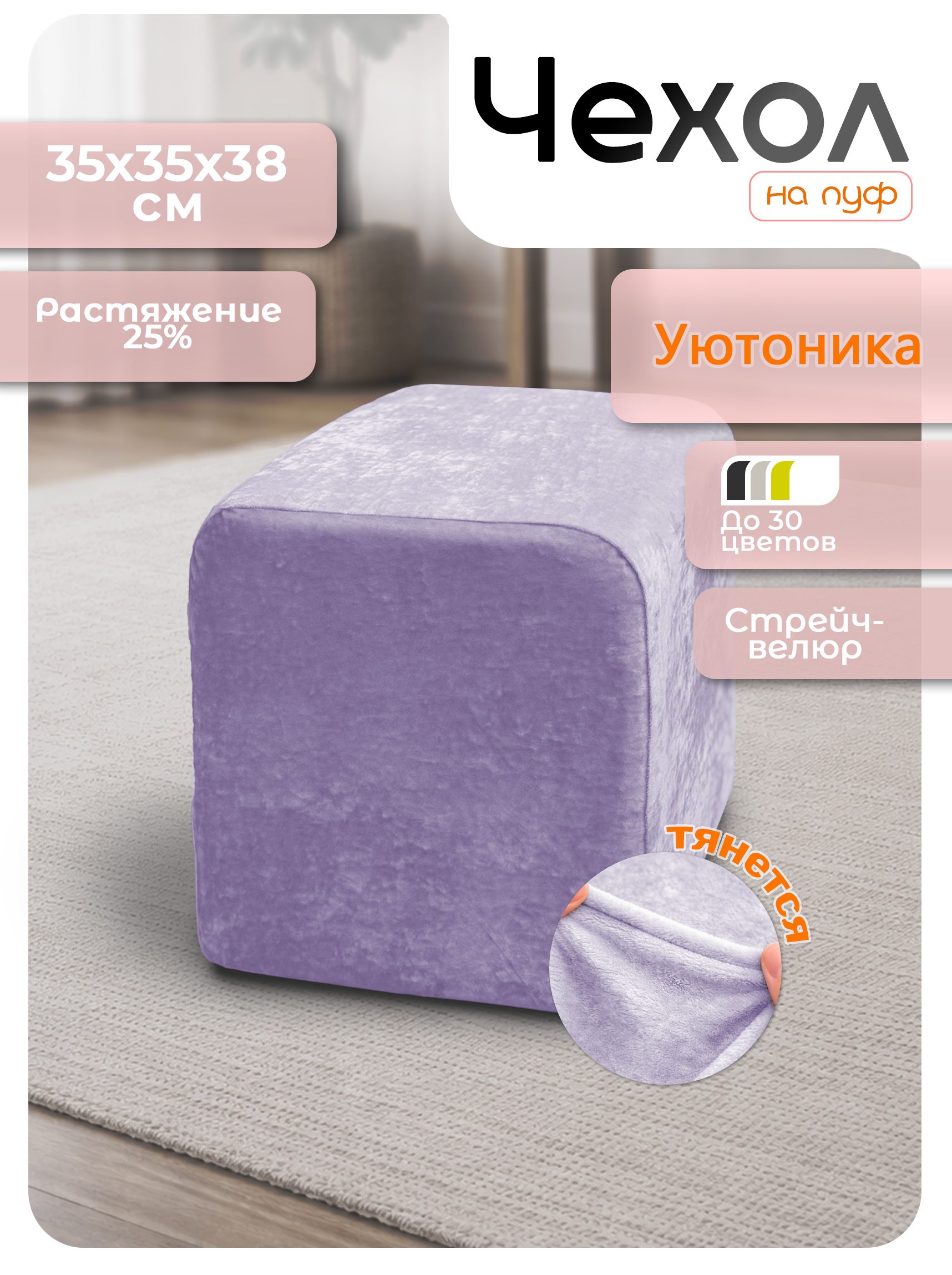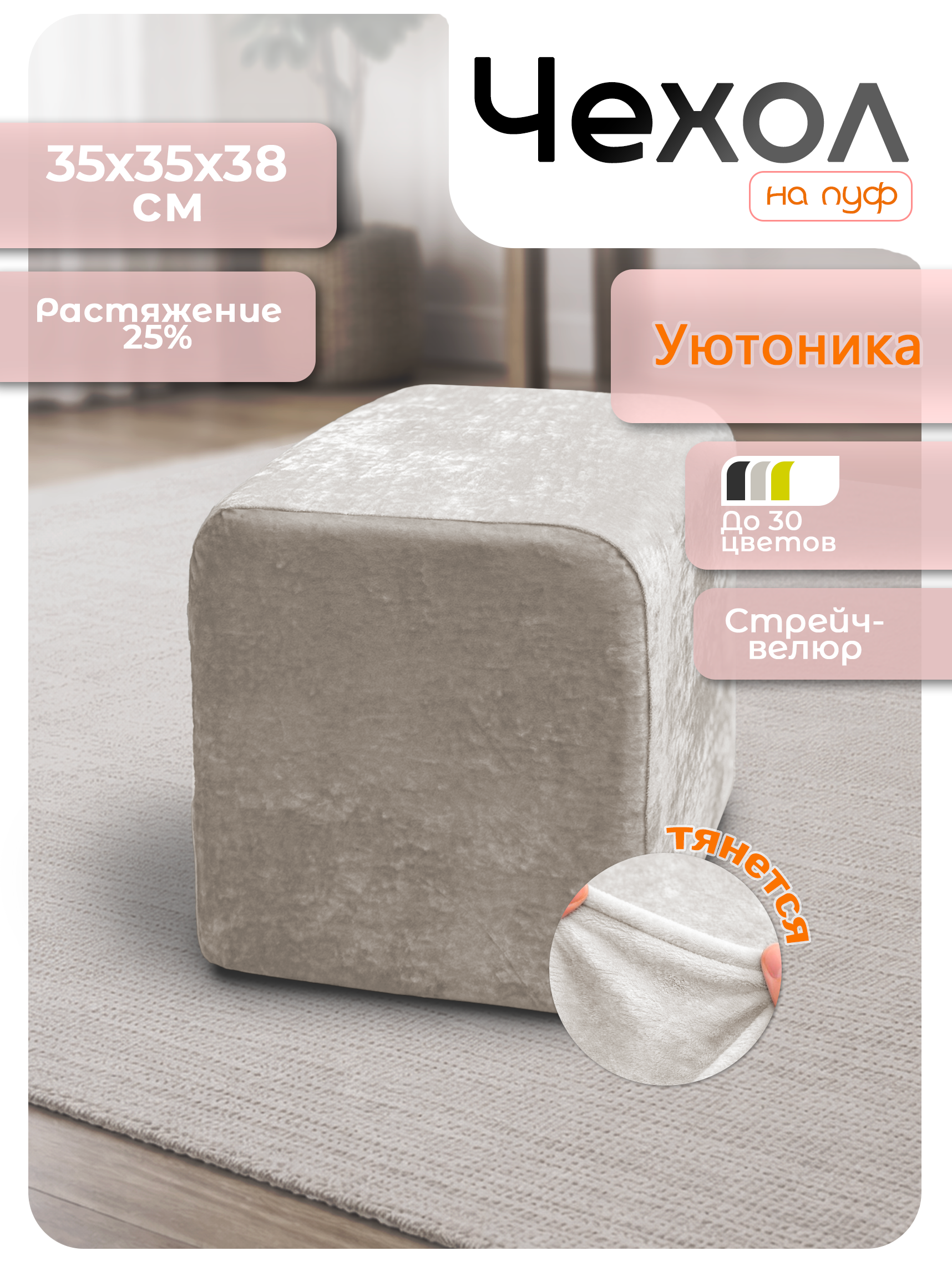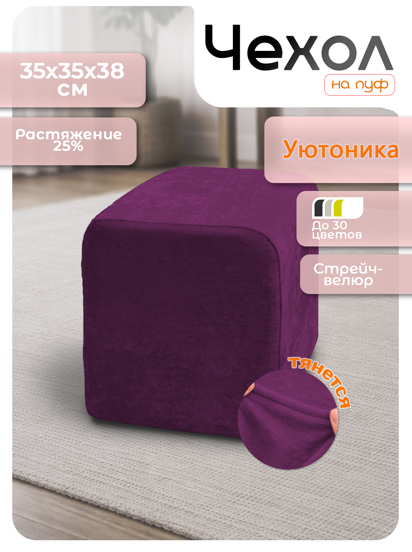 Квадратный чехол на пуфик размером 35 на 35 см и высотой 38 см изготовлен из стрейчевого велюра, который тянется до 25%. Снизу чехол фиксируется резинкой. Эта накидка защитит ваш пуфик от загрязнений, царапин, когтей домашних животных и потёртостей, придаст ему новый вид и поднимет настроение.