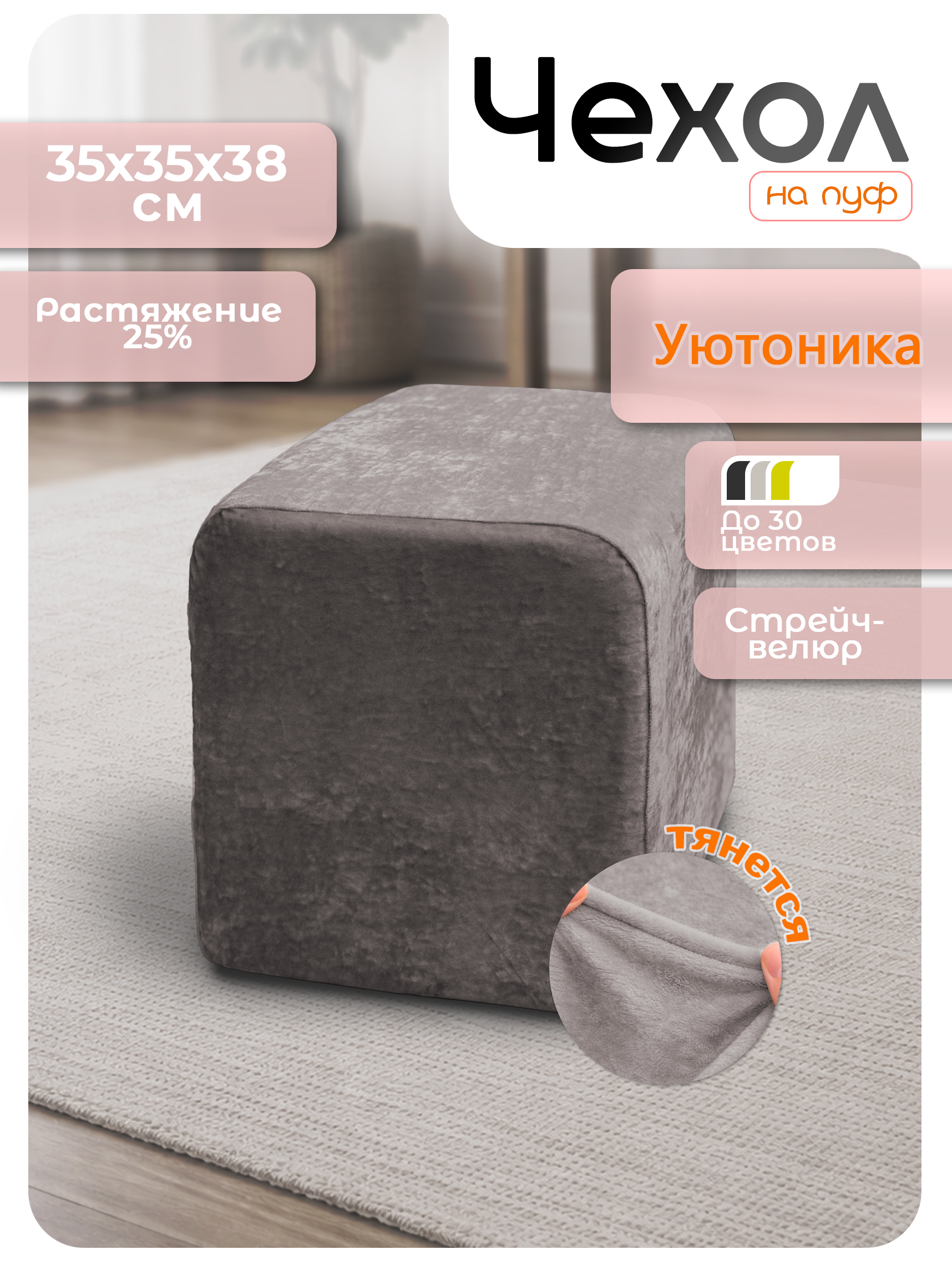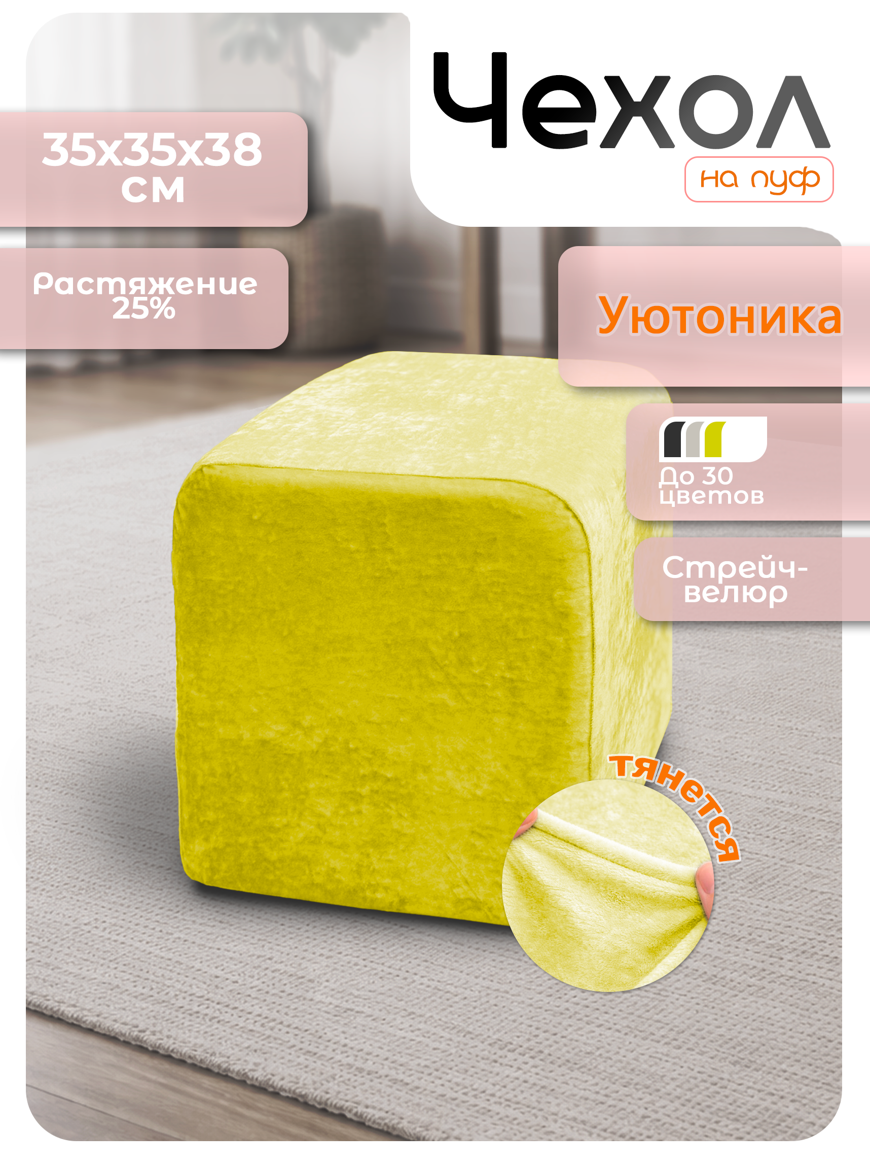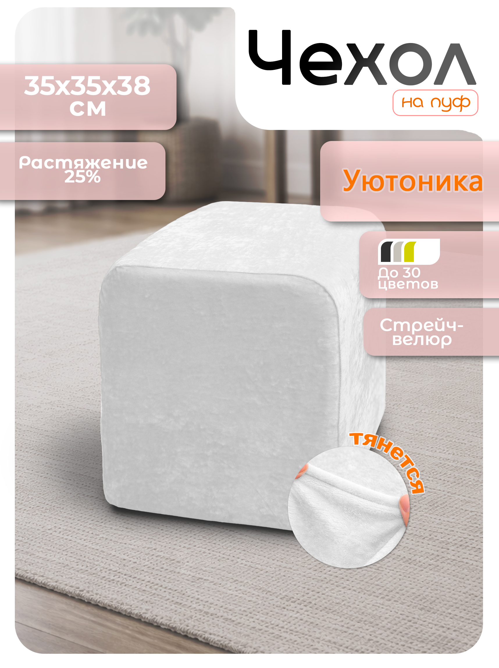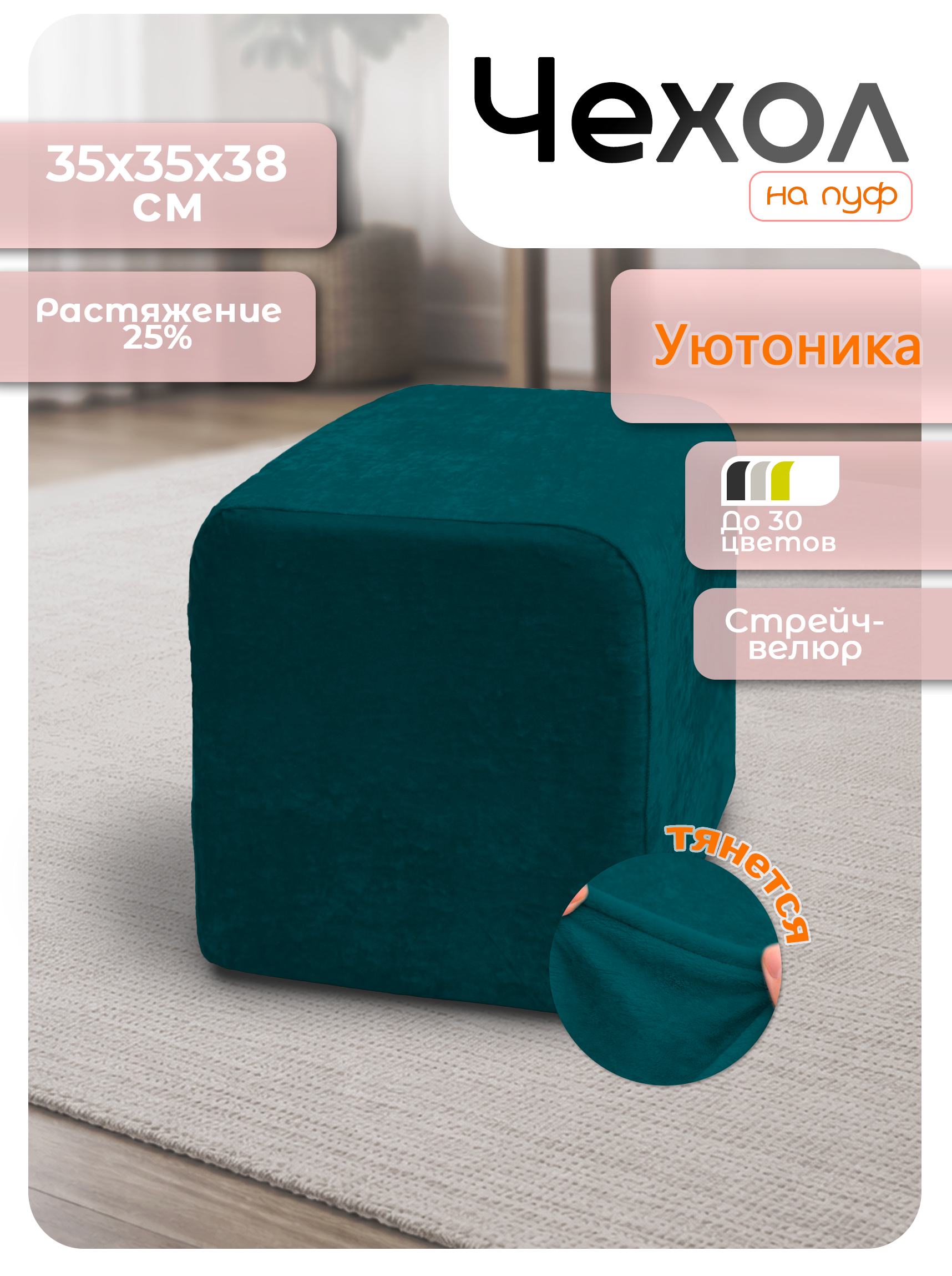 Квадратный чехол на пуфик размером 35 на 35 см и высотой 38 см изготовлен из стрейчевого велюра, который тянется до 25%. Снизу чехол фиксируется резинкой. Эта накидка защитит ваш пуфик от загрязнений, царапин, когтей домашних животных и потёртостей, придаст ему новый вид и поднимет настроение.