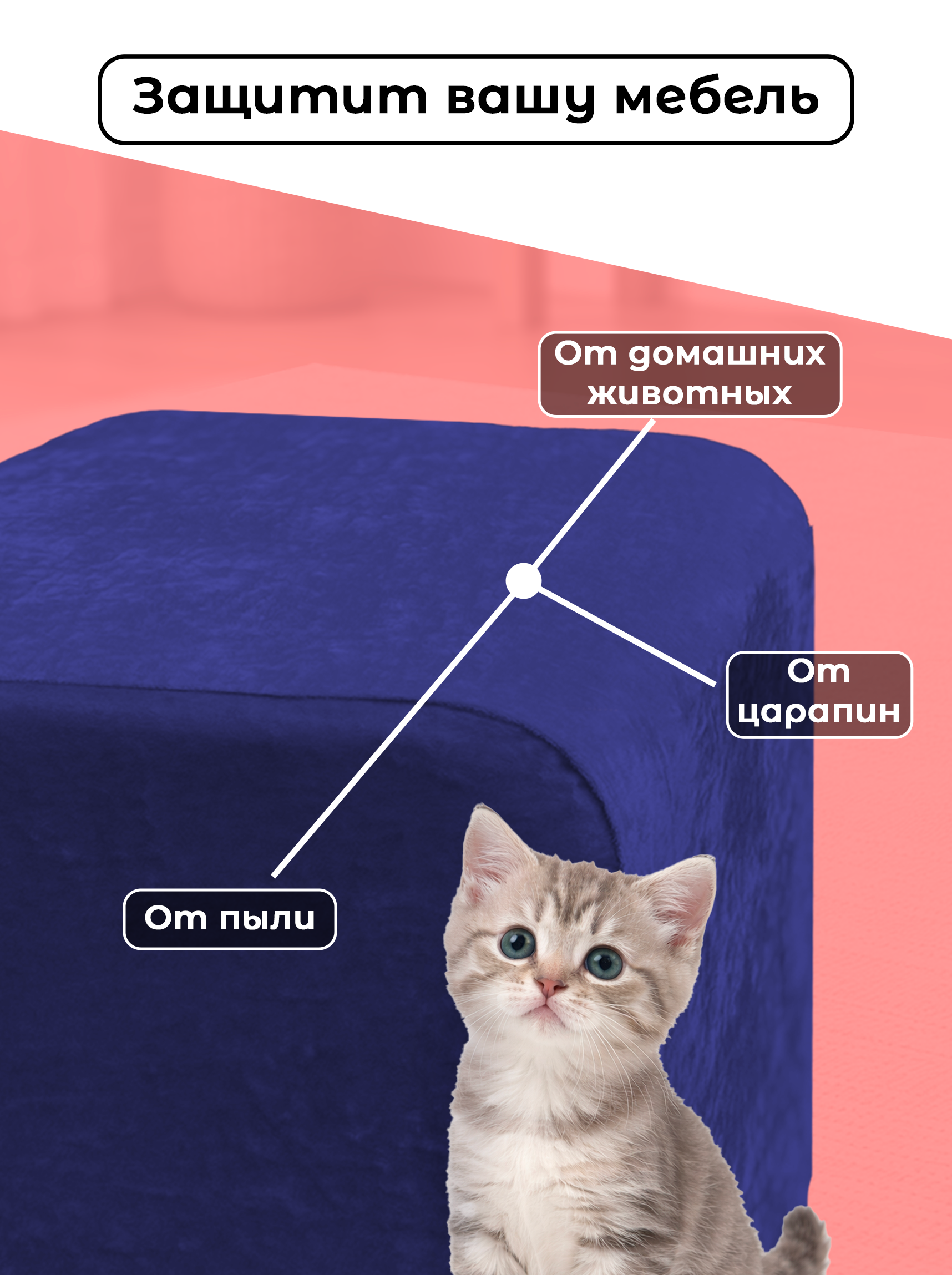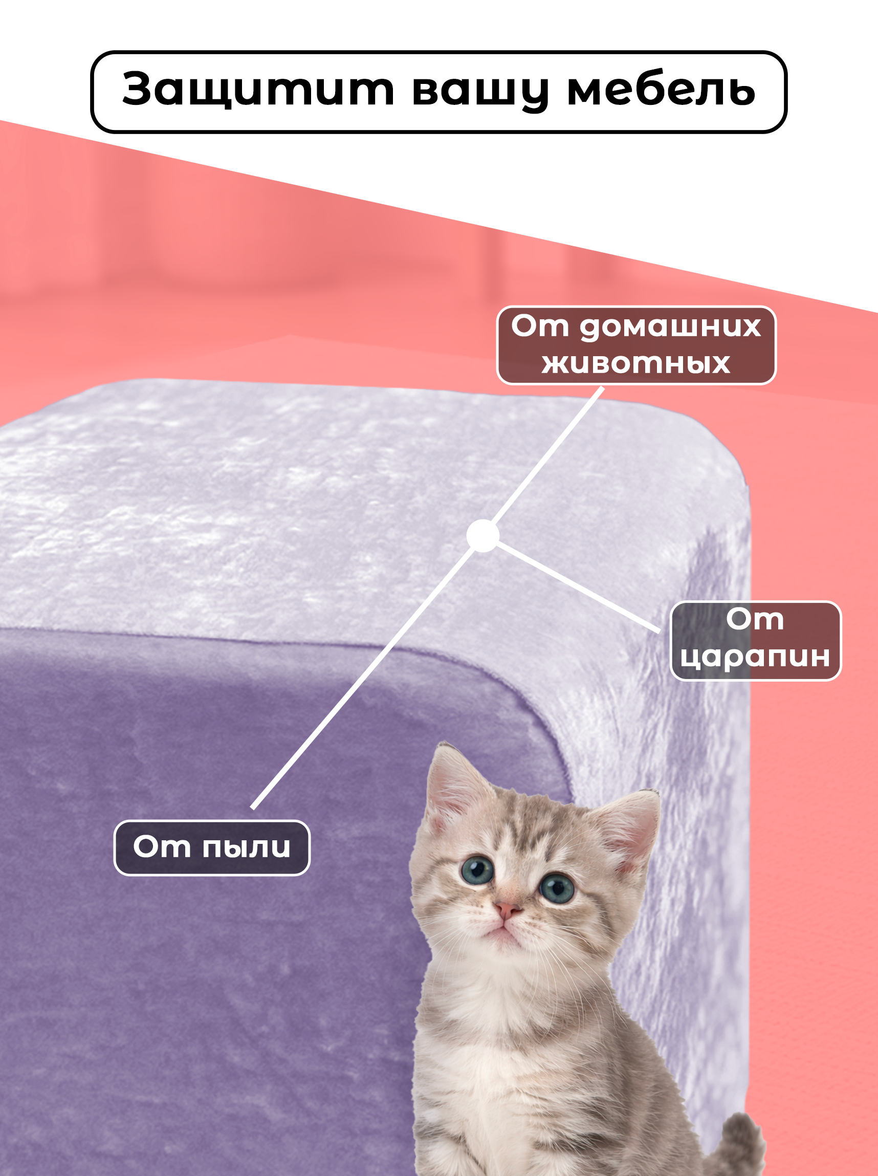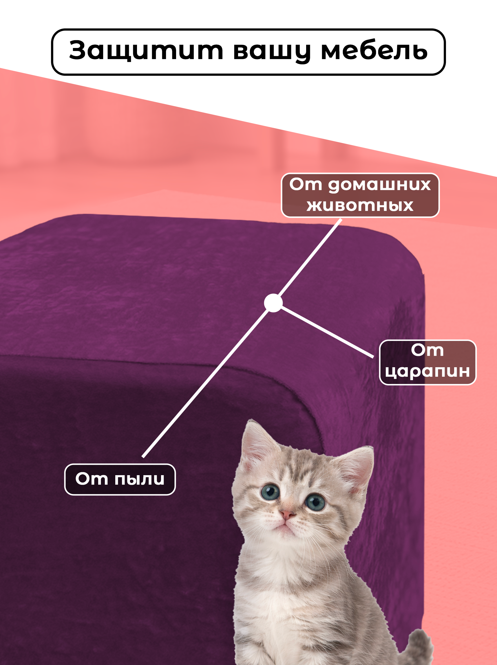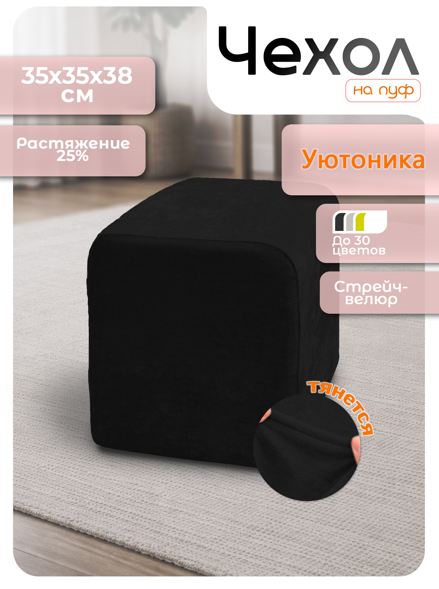 Квадратный чехол на пуфик размером 35 на 35 см и высотой 38 см изготовлен из стрейчевого велюра, который тянется до 25%. Снизу чехол фиксируется резинкой. Эта накидка защитит ваш пуфик от загрязнений, царапин, когтей домашних животных и потёртостей, придаст ему новый вид и поднимет настроение.