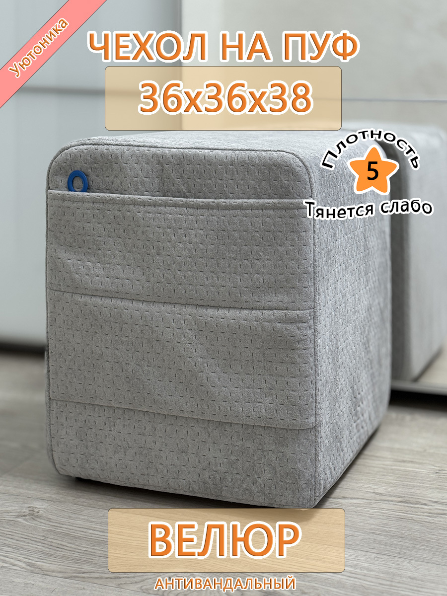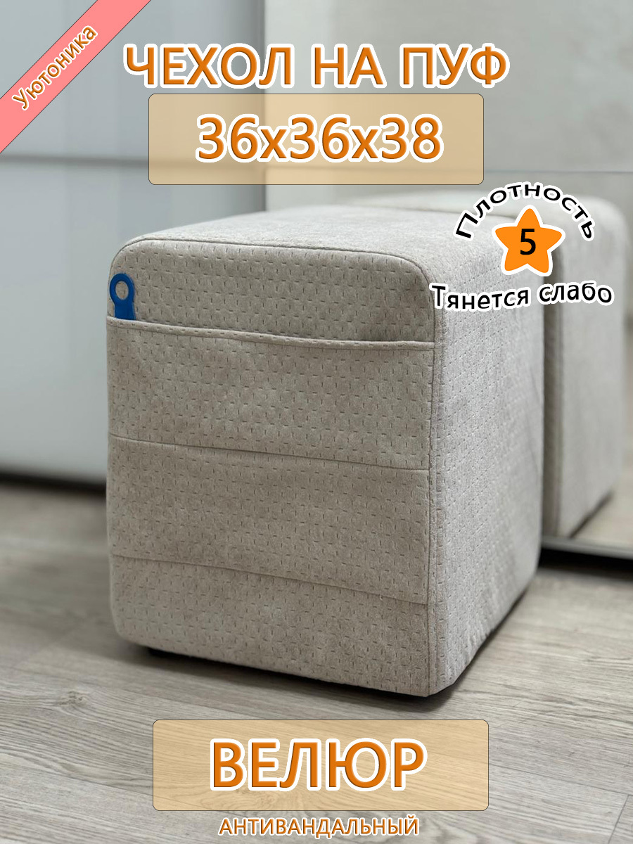 Чехол на пуфик квадратный 36 на 36 см высотой 38 см. Чехол на пуфик изготовлен из антивандального велюра. Материал не тянется. Чехол может подойти на пуфик квадратный 35 на 35, при этом высота его изменится соответственно. Снизу фиксируется крепким шнурком - более надёжным аналогом резинки. Эта накидка на пуф защитит Ваш пуфик от загрязнений, царапин, когтей домашних животных и потёртостей. Чехол на пуфик вернёт жизнь Вашему старому пуфу, добавит изюминку интерьеру и поднимет Вам настроение. Чехол легко очищается от шерсти домашних животных, пыли, грязи и пятен. Чехол из велюра стирается в стиральной машине при температуре 30-40 градусов. Изделие будет служить Вам долгие годы!