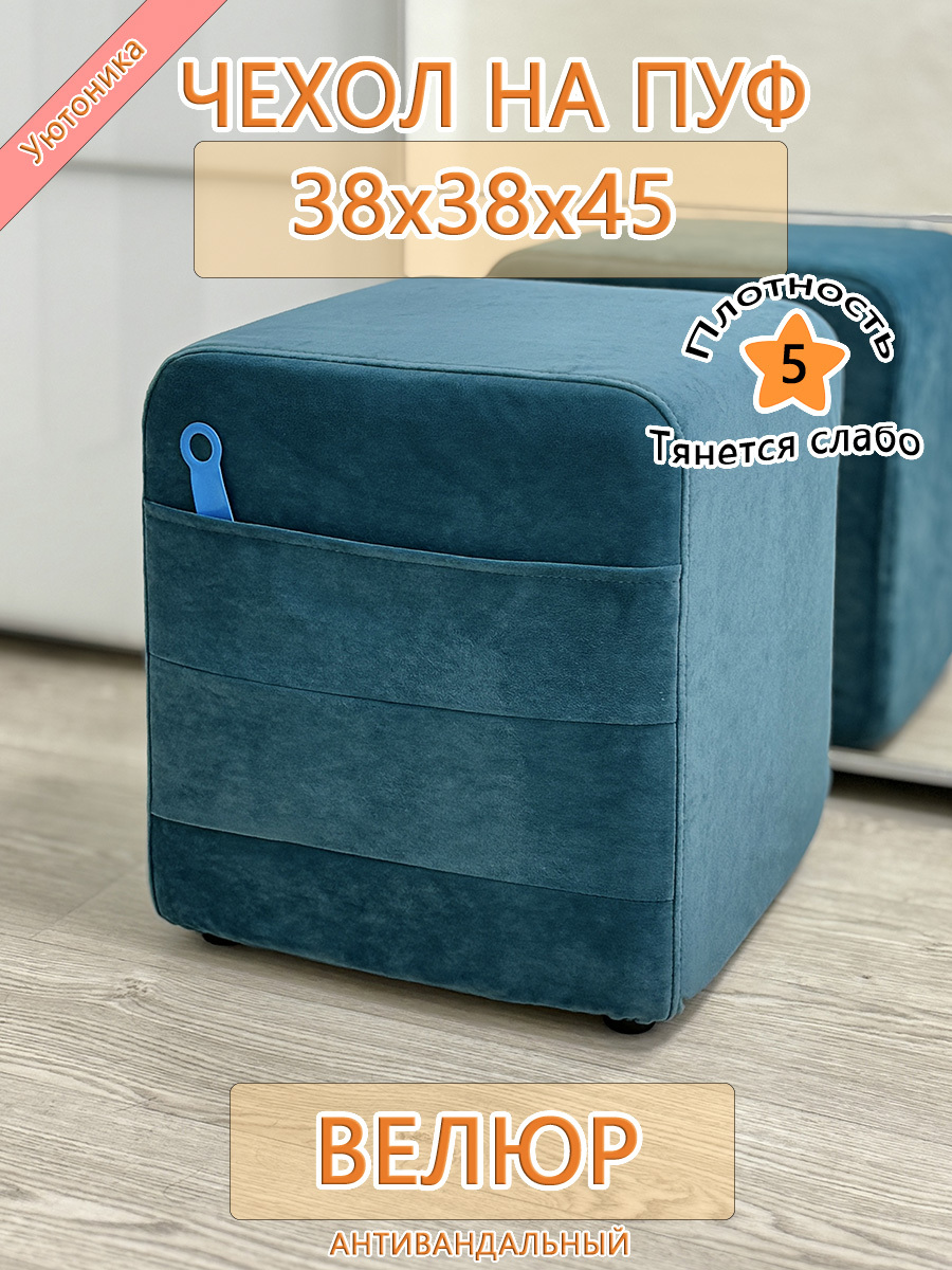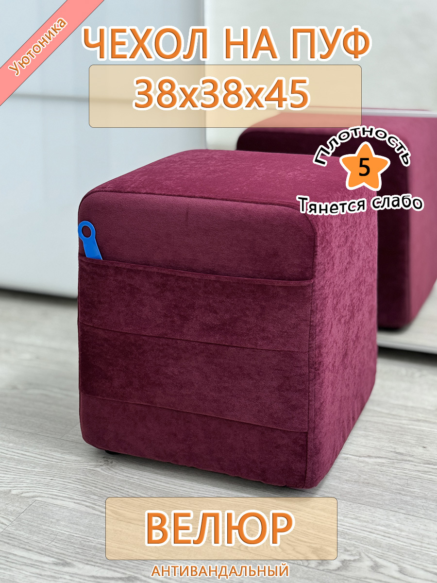 Чехол на пуфик квадратный 38 на 38 см высотой 45 см. Чехол на пуфик изготовлен из антивандального велюра. Чехол может подойти на пуфик квадратный 37 на 37, при этом высота его изменится соответственно. Снизу фиксируется крепким шнурком - более надёжным аналогом резинки. Эта накидка на пуф защитит Ваш пуфик от загрязнений, царапин, когтей домашних животных и потёртостей. Чехол на пуфик вернёт жизнь Вашему старому пуфу, добавит изюминку интерьеру и поднимет Вам настроение. Чехол легко очищается от шерсти домашних животных, пыли, грязи и пятен. Чехол из велюра стирается в стиральной машине при температуре 30-40 градусов. Изделие будет служить Вам долгие годы!