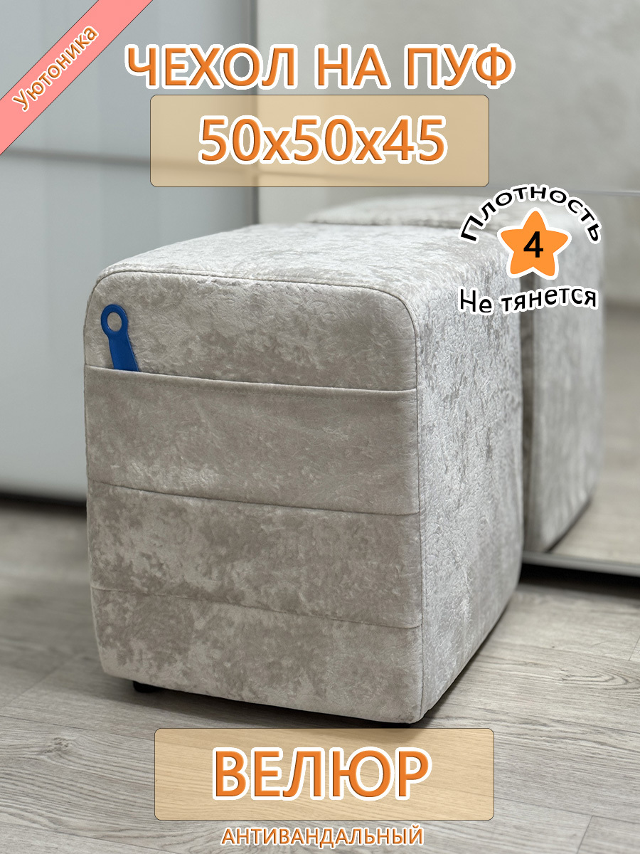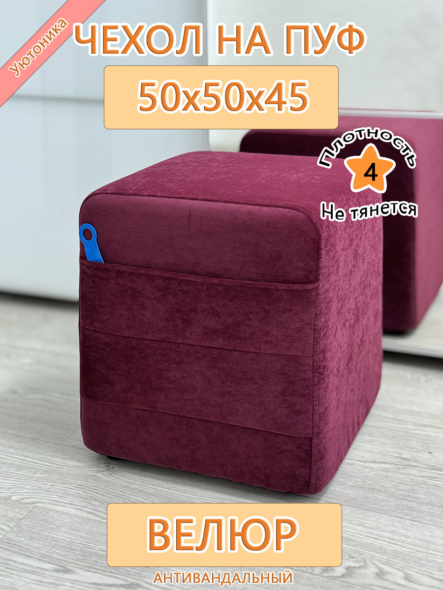Чехол на пуфик квадратный 50 на 50 см, высотой 45 см. Чехол на пуфик изготовлен из антивандального велюра. Материал не тянется. Чехол может подойти на пуфик квадратный 49 на 49 см и 51 на 51 см, при этом высота его изменится соответственно. Снизу фиксируется крепким шнурком - более надёжным аналогом резинки. Эта накидка на пуф защитит Ваш пуфик от загрязнений, царапин, когтей домашних животных и потёртостей. Чехол на пуфик вернёт жизнь Вашему старому пуфу, добавит изюминку интерьеру и поднимет Вам настроение. Чехол легко очищается от шерсти домашних животных, пыли, грязи и пятен. Чехол из велюра стирается в стиральной машине при температуре 30-40 градусов. Изделие будет служить Вам долгие годы! Чтобы правильно подобрать размер чехла переверните свой пуфик вниз сиденьем, измерьте его высоту от пола до дна, измерьте расстояние от края до ножек на подгиб. Для измерения длины и ширины положите пуф на бок и измерьте расстояние от пола до верхней точки.