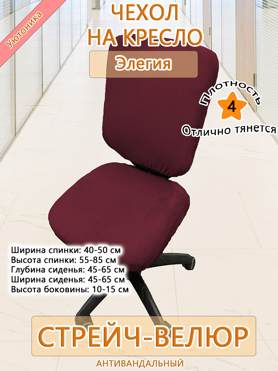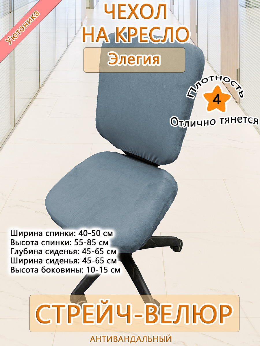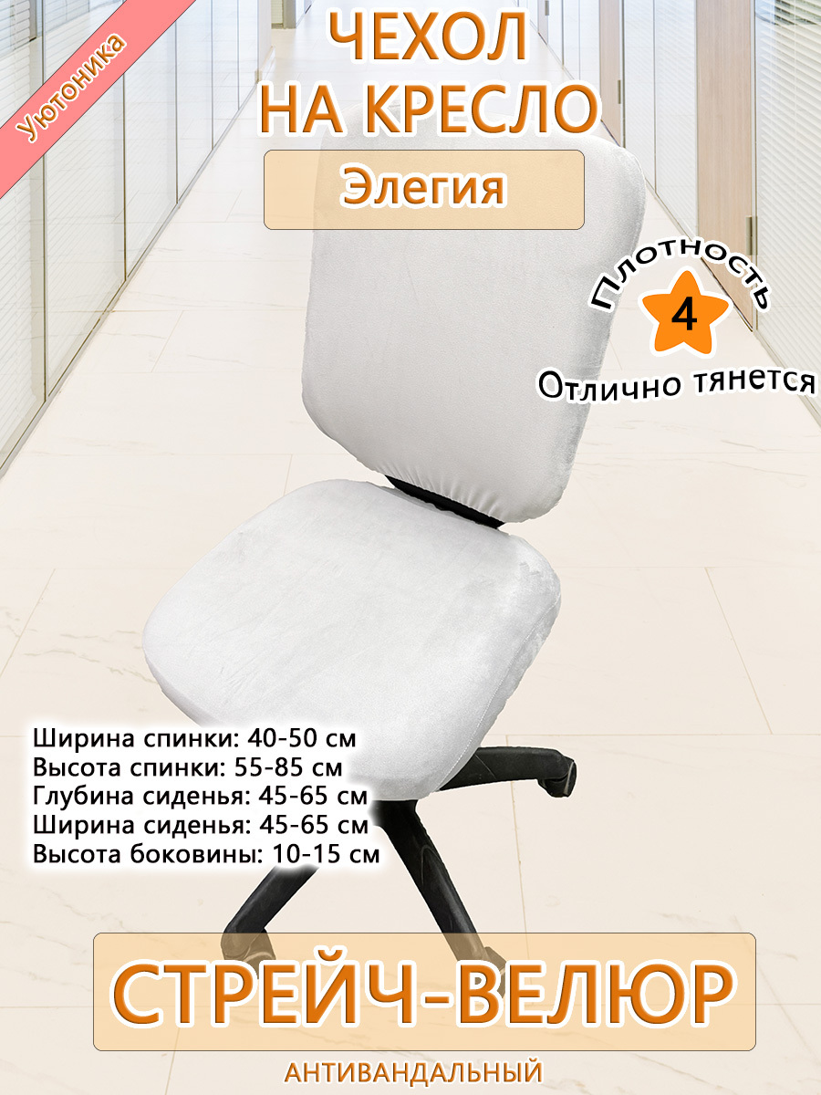 Безразмерный чехол для офисного компьютерного кресла Элегия изготовлен из тянущегося велюра. Не требует особых навыков для надевания. Спинка и сиденье снизу фиксируются крепкой резинкой. Может подойти и на другие модели офисных кресел при совпадении заявленных размерных параметров.