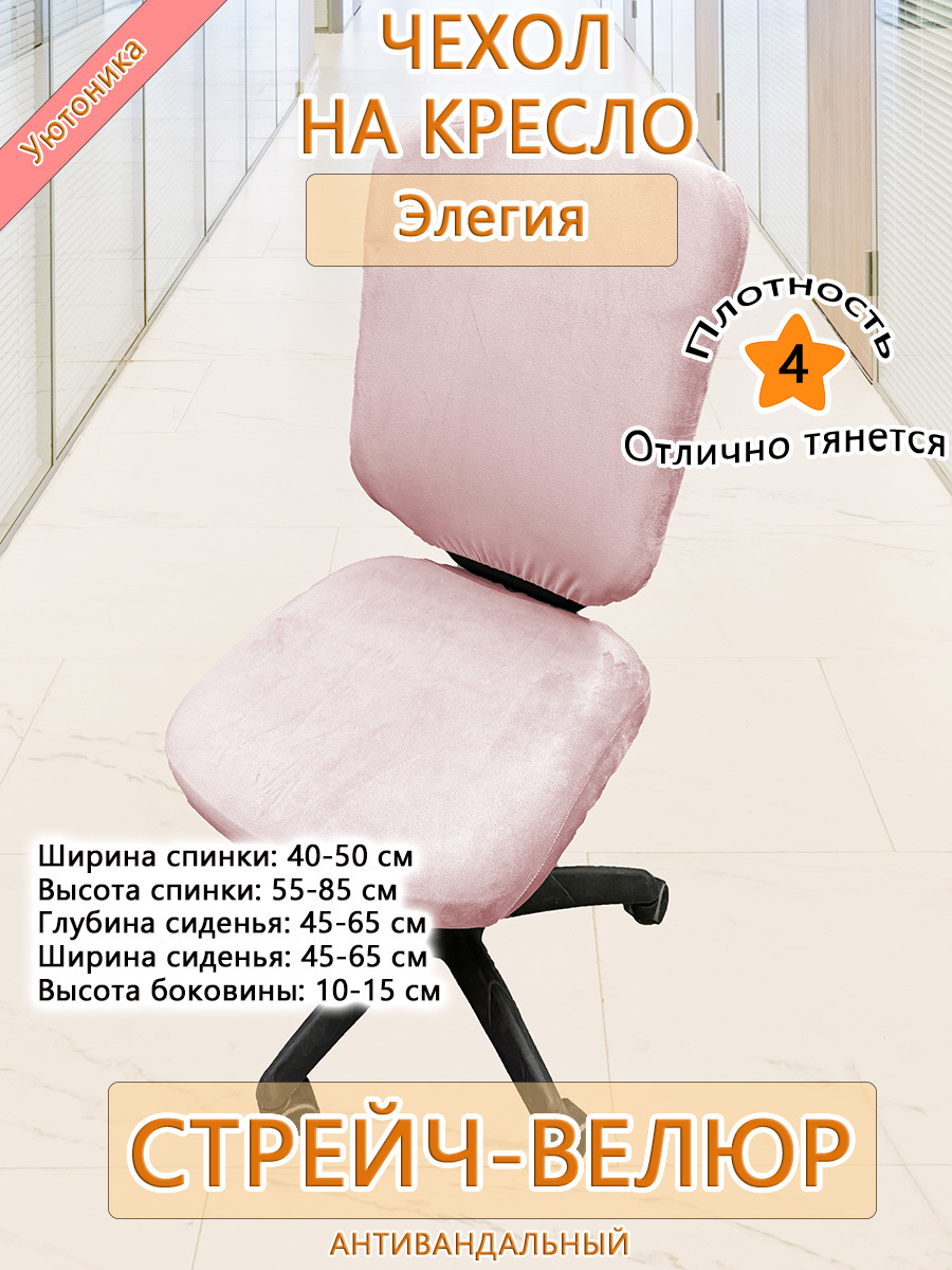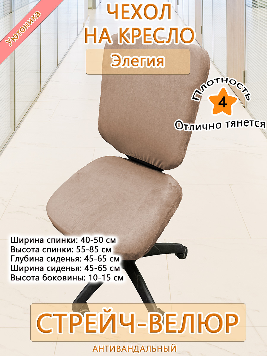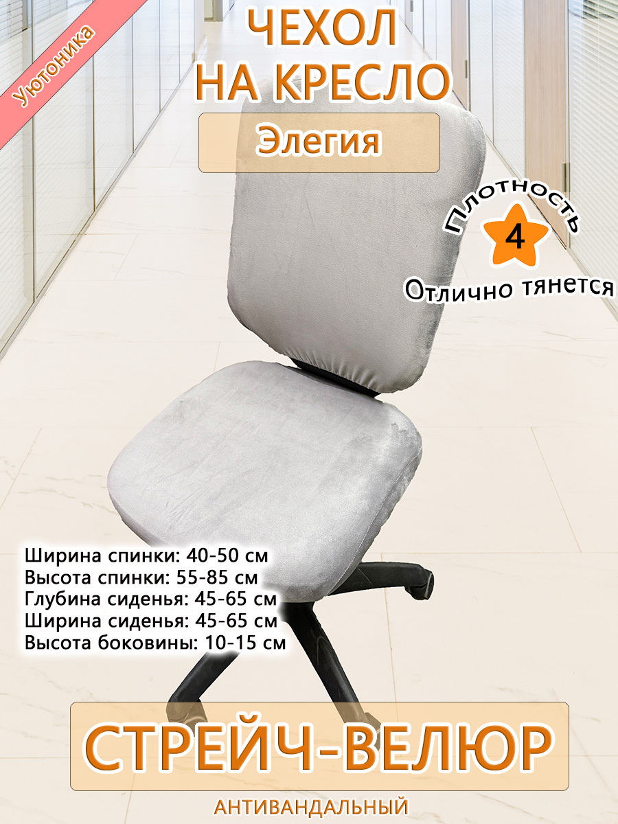 Безразмерный чехол для офисного компьютерного кресла Элегия изготовлен из тянущегося велюра. Не требует особых навыков для надевания. Спинка и сиденье снизу фиксируются крепкой резинкой. Может подойти и на другие модели офисных кресел при совпадении заявленных размерных параметров.
