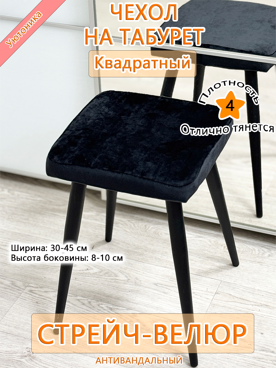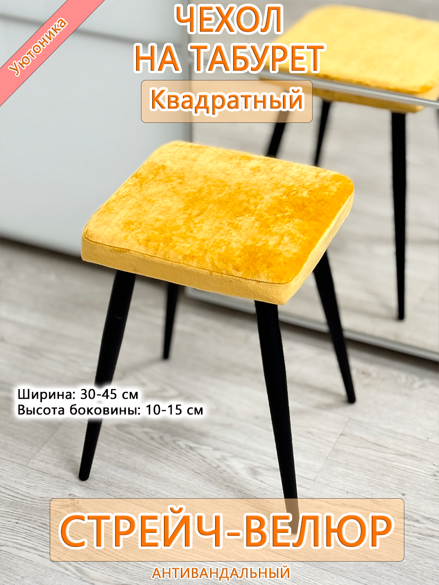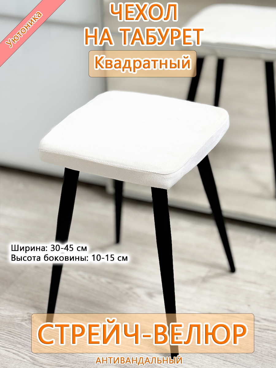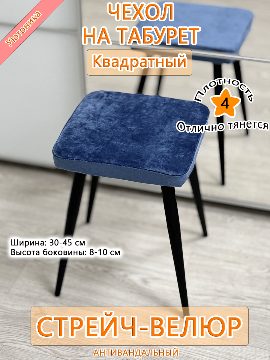 Комплект из 4х чехлов для квадратных табуретов. Чехлы для стульев без спинки очень хорошо тянутся и могут подойти почти на любые стандартные табуреты. Снизу фиксируются крепкой резинкой.