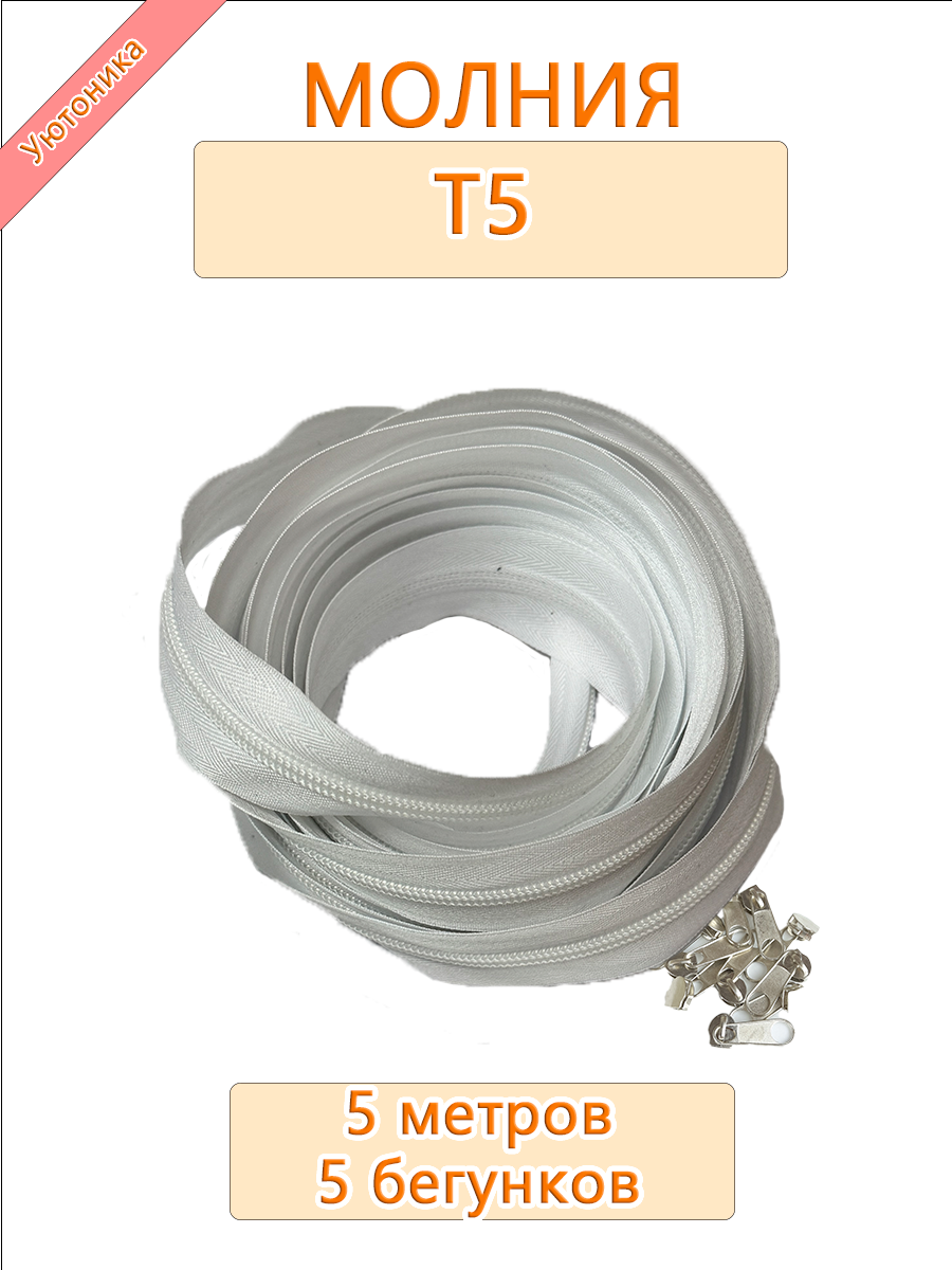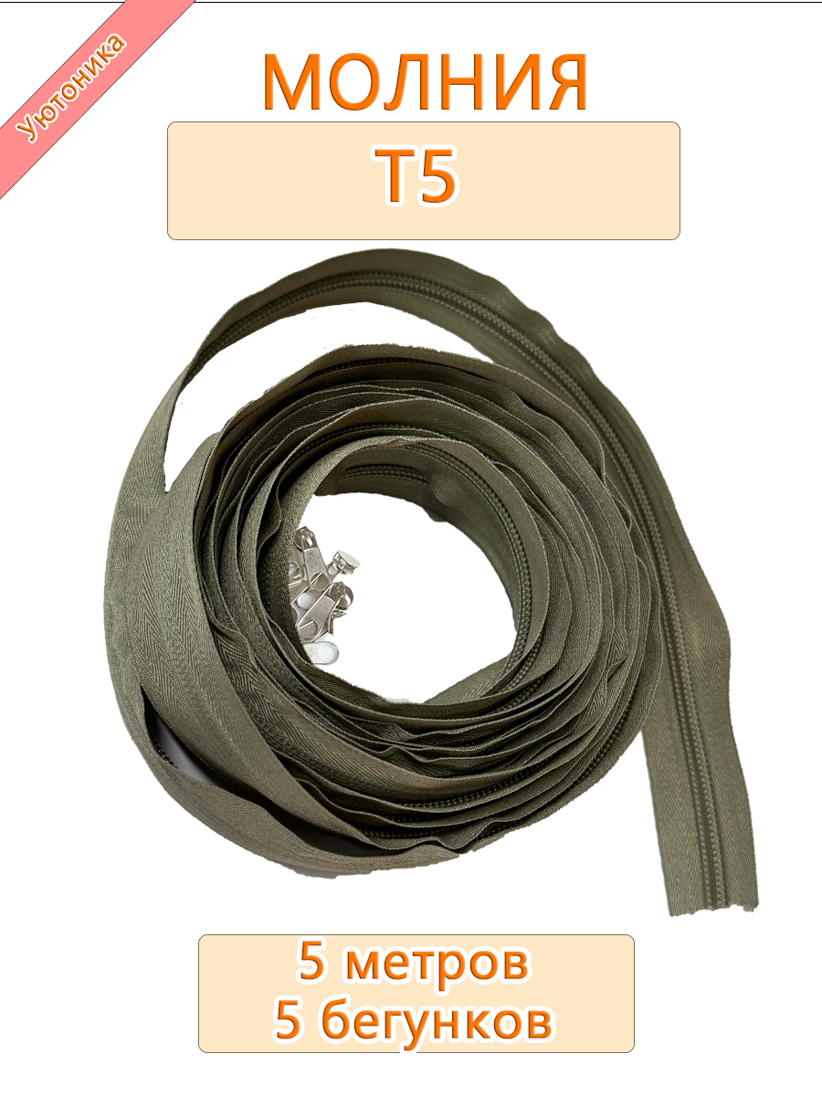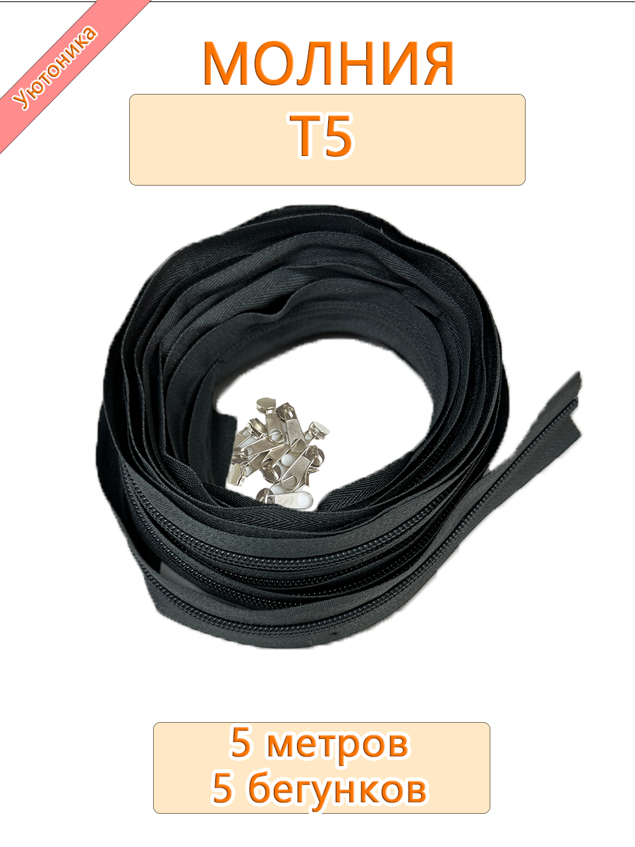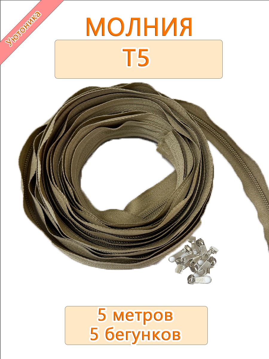 Молния (спираль) Т5 отрезная 5 метров. В комплекте 5 бегунков.